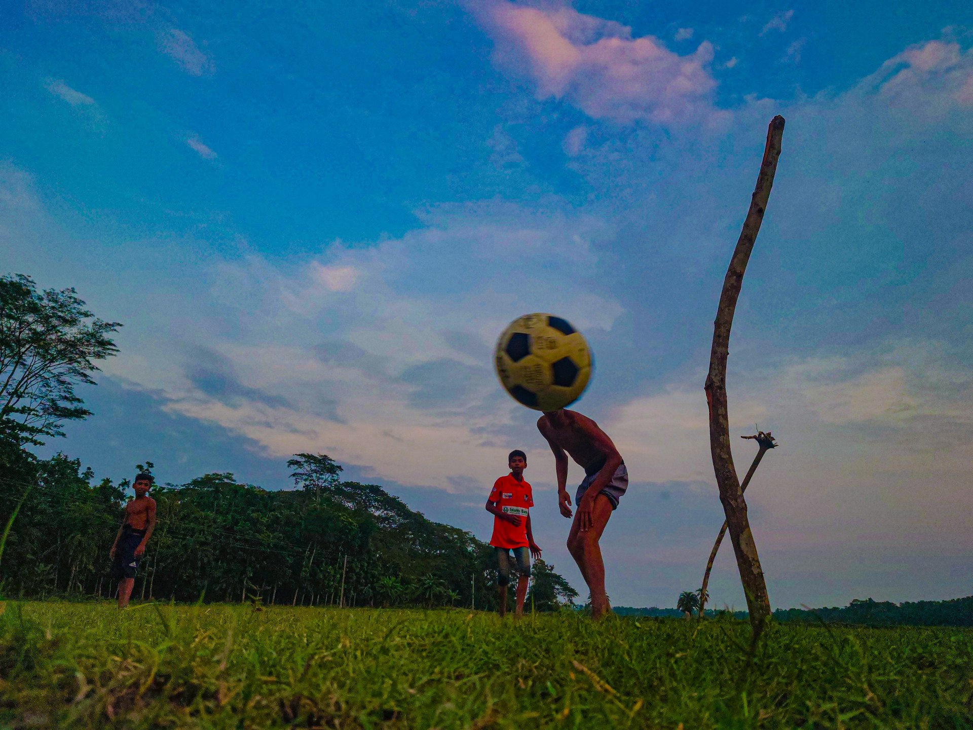 Story : Village boys play football with branch goalposts on a lush monsoon afternoon, capturing rural simplicity against a vibrant sky.