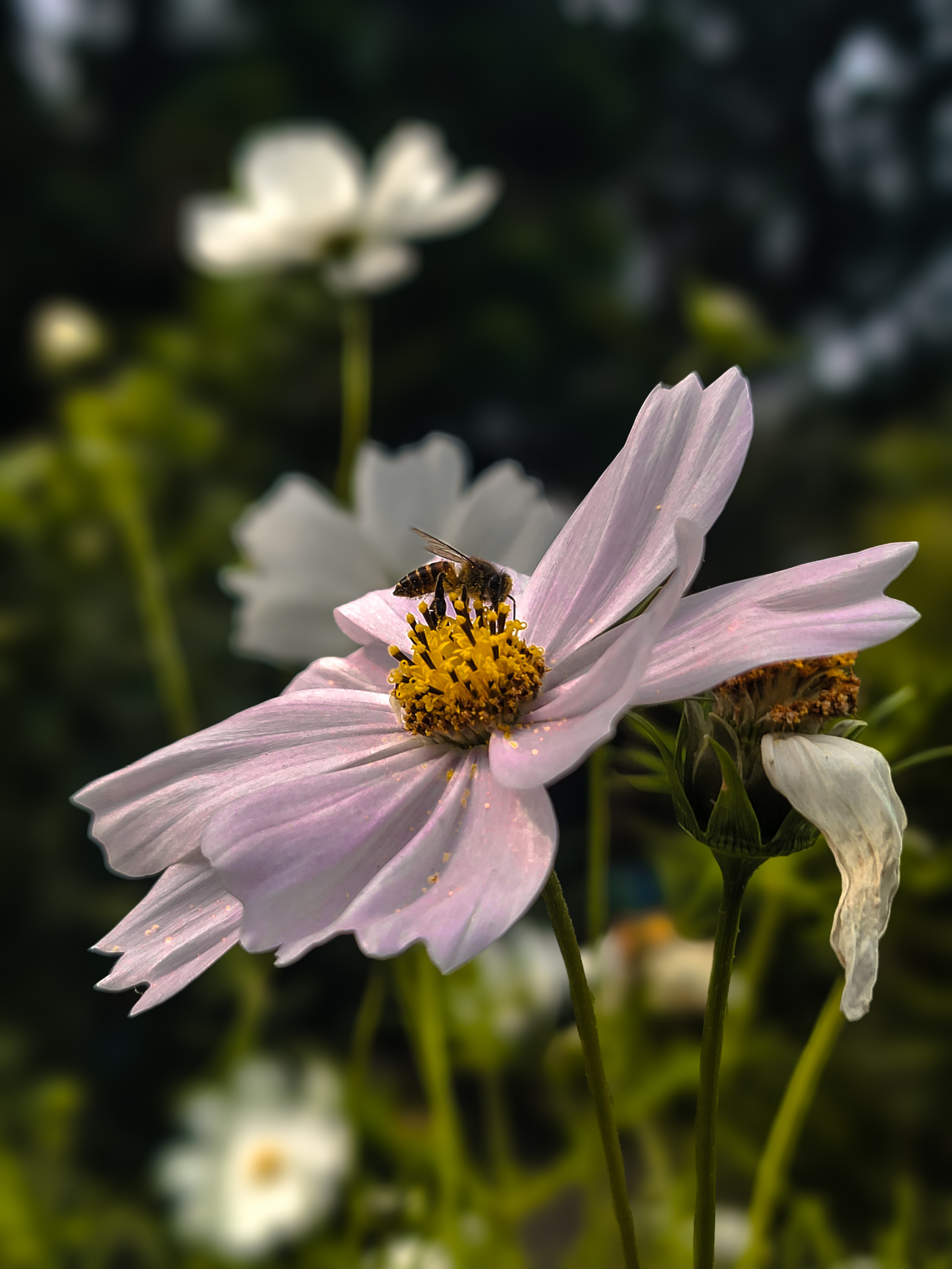 Story : Buzz felt the sun warm his stripes as he dove into the Cosmos. Golden dust coated his legs-the sweet reward of his labor. He gathered the pollen, ready to fly home and share his nectar treasure.