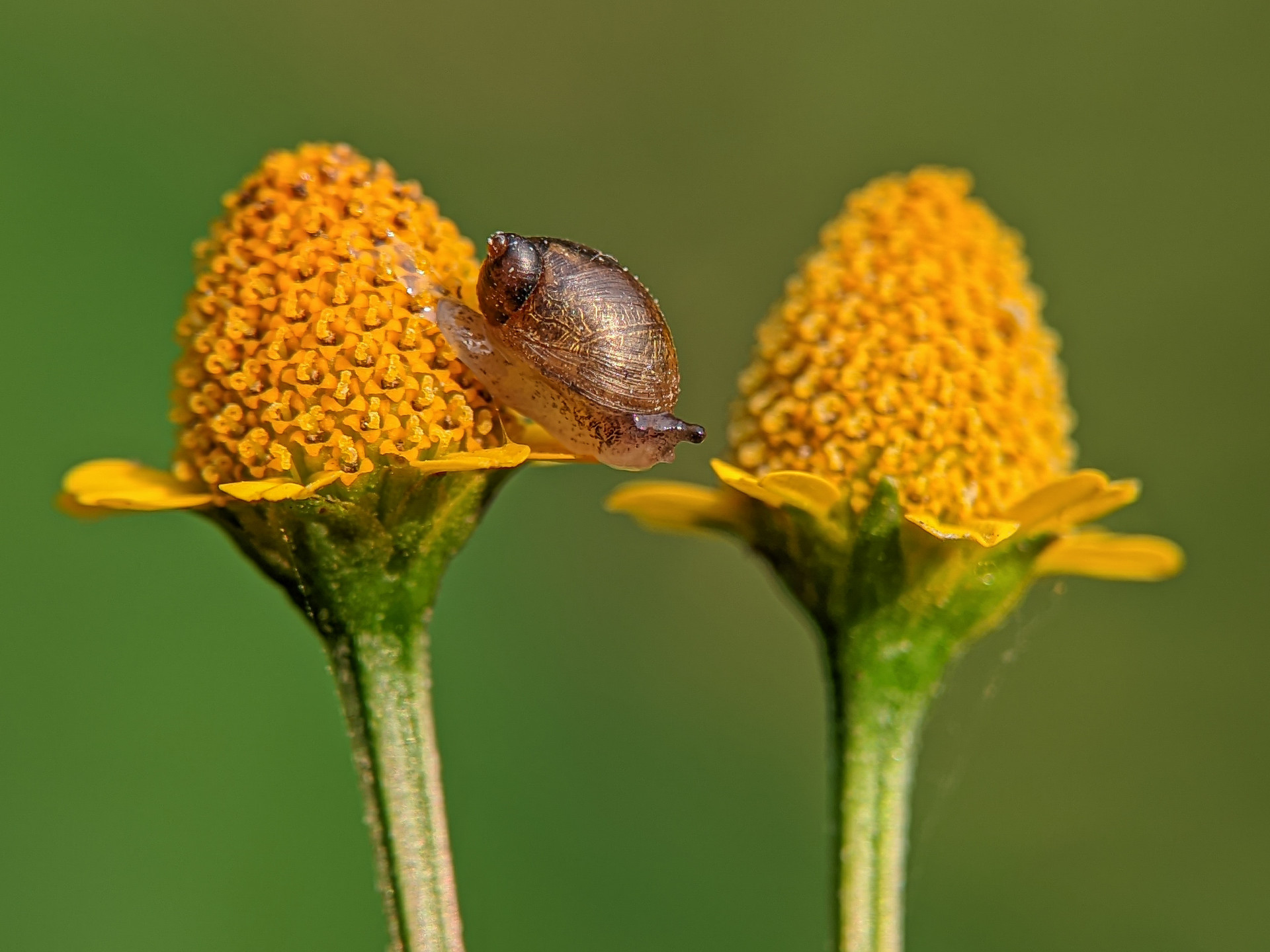 Image Title : The snail is moving from one flower to another.